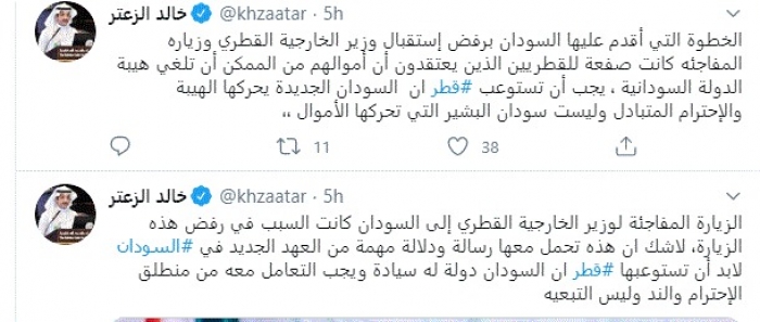 وقال في تغريدات عبر "تويتر" رصدها "المشهد العربي": "الزيارة المفاجئة لوزير الخارجية القطري إلى السودان كانت السبب في رفض هذه الزيارة، لا شك أن هذه تحمل معها رسالة ودلالة مهمة من العهد الجديد في السودان لا بد أن تستوعبها قطر أن السودان دولة له سيادة ويجب التعامل معه من منطلق الاحترام والند وليس التبعية".