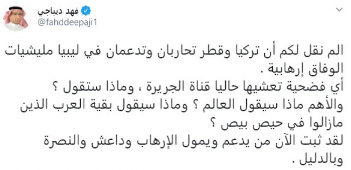 وقال في تغريدة عبر "تويتر" رصدها "المشهد العربي": "ألم نقل لكم أن تركيا وقطر تحاربان وتدعمان في ليبيا مليشيات الوفاق إرهابية. أي فضحية تعشيها حاليًا قناة الجزيرة، وماذا ستقول؟".