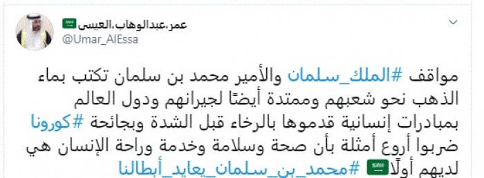 وقال في تغريدة عبر "تويتر" رصدها "المشهد العربي": "مواقف الملك سلمان والأمير محمد بن سلمان تكتب بماء الذهب نحو شعبهم وممتدة أيضًا لجيرانهم ودول العالم بمبادرات إنسانية قدموها بالرخاء قبل الشدة".