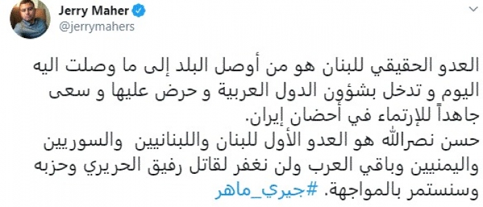 وكتب في تغريدة عبر "تويتر" رصدها "المشهد العربي": "العدو الحقيقي للبنان هو من أوصل البلد إلى ما وصلت اليه اليوم و تدخل بشؤون الدول العربية وحرض عليها و سعى جاهداً للإرتماء في أحضان إيران".