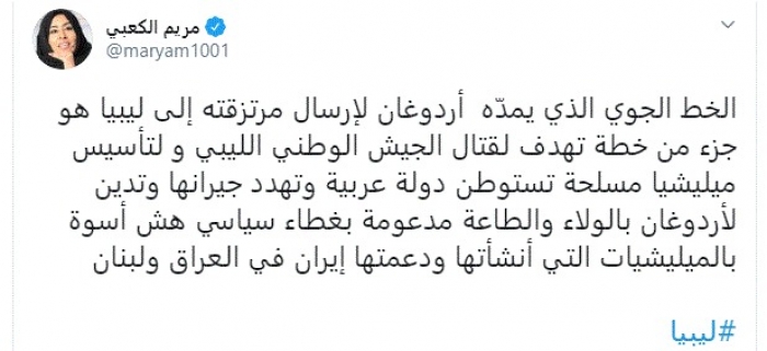 كشفت الكاتبة والإعلامية الإماراتية مريم الكعبي، اليوم، مُخططات الرئيس التركي رجب طيب أردوغان في ليبيا من خلال إرسال المرتزقة إلى جبهات القتال هناك.