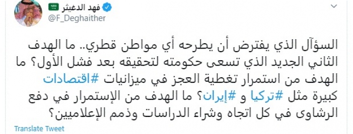 وقال في تغريدة عبر "تويتر" رصدها "المشهد العربي": "السؤآل الذي يفترض أن يطرحه أي مواطن قطري.. ما الهدف الثاني الجديد الذي تسعى حكومته لتحقيقه بعد فشل الأول؟".