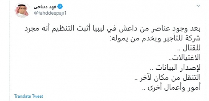 وقال في تغريدة عبر "تويتر" رصدها "المشهد العربي": "بعد وجود عناصر من داعش في ليبيا أثبت التنظيم أنه مجرد شركة للتأجير ويخدم من يموله: للقتال.. الاغتيالات.. لإصدار البيانات.. التنقل من مكان لآخر.. أمور وأعمال أخرى".