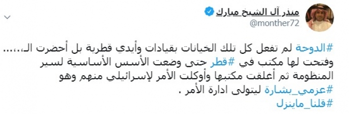 فتح المدون السعودي البارز منذر آل الشيخ مبارك، اليوم الإثنين، النار على النظام القطري.