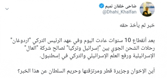 وكتب عبر تغريدة له على تويتر" رصدها " المشهد العربي ":"خبر لم يأخذ حقه، بعد انقطاع 10 سنوات عادت اليوم وفي عهد الرئيس التركي "أردوغان" رحلات الشحن الجوي بين "إسرائيل وتركيا" لصالح شركة "العال" الإسرائيلية ورفع العلم الإسرائيلي والتركي في إسطنبول".