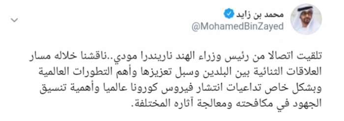تلقى ولي عهد أبوظبي نائب القائد الأعلى للقوات المسلحة الإماراتية محمد بن زايد آل نهيان، اليوم الإثنين، اتصالاً هاتفيًا مع رئيس وزراء الهند.