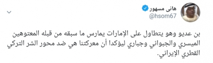 وكتب مسهور عبر تغريدة له على "تويتر" رصدها "المشهد العربي":"بن عديو وهو يتطاول على الإمارات يمارس ما سبقه من قبله المعتوهين الميسري والجبواني وجباري ليؤكدا أن معركتنا هي ضد محور الشر التركي القطري الإيراني".