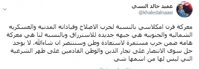 وكتب عبر تغريدة له على "تويتر" رصدها " المشهد العربي":"معركة قرن مكلاسي بالنسبة لحزب الإصلاح وقياداته المدنية والعسكرية الشمالية والجنوبية هي جبهة جديدة للاسترزاق وبالنسبة لنا هي معركة هامة ضمن حرب مستمرة لاستعادة وطن وسننتصر إن شاء الله".
