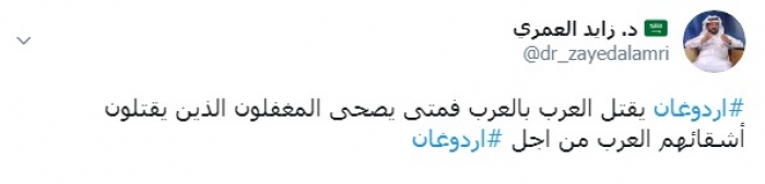 وكتب عبر تغريدة له على "تويتر" رصدها " المشهد العربي":"أردوغان يقتل العرب بالعرب فمتى يصحى المغفلون الذين يقتلون أشقائهم العرب من أجل أردوغان".
