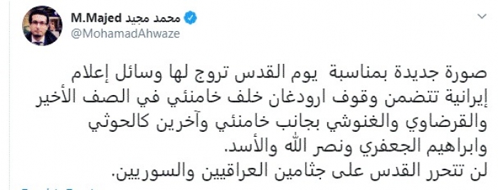 وقال في تغريدة عبر "تويتر" رصدها "المشهد العربي": "صورة جديدة بمناسبة يوم القدس تروج لها وسائل إعلام إيرانية تتضمن وقوف أرودغان خلف خامنئي في الصف الأخير والقرضاوي والغنوشي بجانب خامنئي وآخرين كالحوثي وإبراهيم الجعفري ونصر الله والأسد".