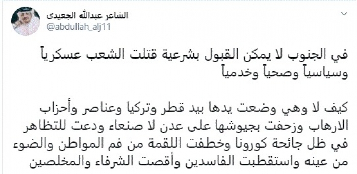 هاجم الشاعر عبدالله الجعيدي، اليوم، حكومة الشرعية، مؤكدًا أنه في الجنوب لا يمكن القبول بشرعية قتلت الشعب عسكريًا وسياسيًا وصحيًا وخدميًا.