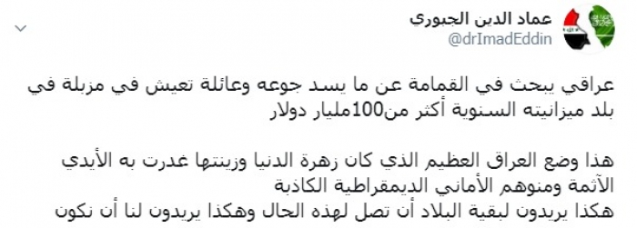 وكتب عبر تغريدة له على "تويتر" رصدها " المشهد العربي": "عراقي يبحث في القمامة عن ما يسد جوعه وعائلة تعيش في مزبلة في بلد ميزانيته السنوية أكثر من100مليار دولار".
