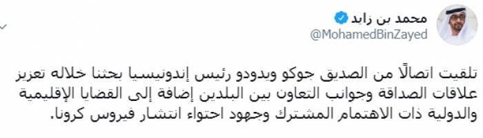 وكتب عبر تغريدة له على "تويتر" رصدها " المشهد العربي":"تلقيت اتصالًا من الصديق جوكو ويدودو رئيس إندونيسيا بحثنا خلاله تعزيز علاقات الصداقة وجوانب التعاون بين البلدين إضافة إلى القضايا الإقليمية والدولية ذات الاهتمام المشترك وجهود احتواء انتشار فيروس كرونا".