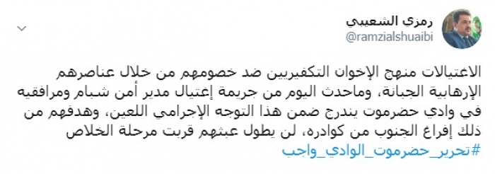 وأضاف:" وماحدث اليوم من جريمة اغتيال مدير أمن شبام ومرافقيه في وادي حضرموت يندرج ضمن هذا التوجه الإجرامي اللعين، وهدفهم من ذلك إفراغ الجنوب من كوادره، لن يطول عبثهم قربت مرحلة الخلاص".
