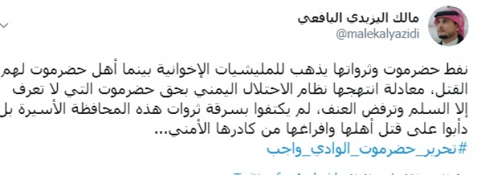 وكتب عبر تغريدة له على "تويتر" رصدها " المشهد العربي":"نفط حضرموت وثرواتها يذهب للمليشيات الإخوانية بينما أهل حضرموت لهم القتل، معادلة انتهجها نظام الاحتلال اليمني بحق حضرموت التي لا تعرف إلا السلم وترفض العنف".