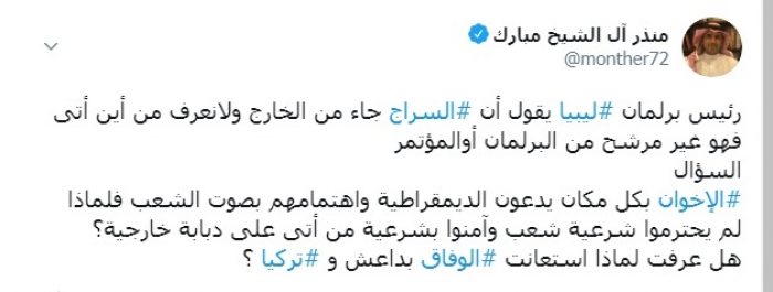 وكتب عبر تغريدة له على "تويتر" رصدها " المشهد العربي": "رئيس برلمان ليبيا يقول أن السراج جاء من الخارج ولا نعرف من أين أتى فهو غير مرشح من البرلمان أو المؤتمر".