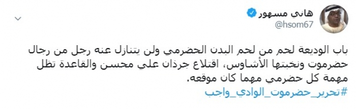 وكتب مسهور عبر تغريدة له على "تويتر " رصدها " المشهد العربي" :"باب الوديعة لحم من لحم البدن الحضرمي ولن يتنازل عنه رجل من رجال حضرموت ونخبتها الأشاوس، اقتلاع جرذان علي محسن والقاعدة تظل مهمة كل حضرمي مهما كان موقعه".