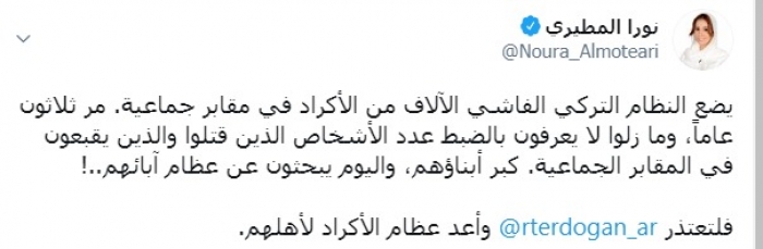 شنت الكاتبة والباحثة نورا المطيري، اليوم الأربعاء، هجوما حادا ضد الرئيس التركي رجب طيب أردوغان.