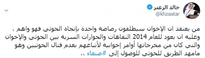 وكتب الزعتر عبر تغريدة له على "تويتر" رصدها "المشهد العربي":من يعتقد أن الإخوان سيطلقون رصاصة واحدة باتجاه الحوثي فهو واهم ، وعليه أن يعود للعام 2014 التفاهمات والحوارات السرية بين الحوثي والإخوان والتي كان من مخرجاتها أوامر إخوانية لأتباعهم بعدم قتال الحوثيين وهو مامهد الطريق للحوثي للوصول إلى صنعاء".