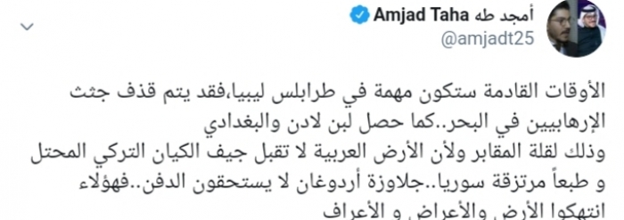 وكتب عبر تغريدة له على " تويتر" رصدها "المشهد العربي":"الأوقات القادمة ستكون مهمة في طرابلس ليبيا،فقد يتم قذف جثث الإرهابيين في البحر كما حصل لبن لادن والبغدادي".