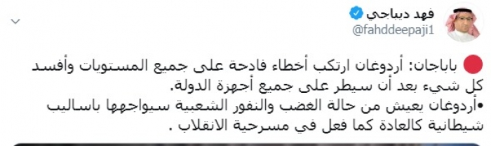 وكتب عبر تغريدة له على "تويتر" رصدها " المشهد العربي":" باباجان يقول أن أردوغان ارتكب أخطاء فادحة على جميع المستويات وأفسد كل شيء بعد أن سيطر على جميع أجهزة الدولة".