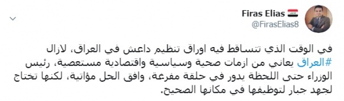 وكتب عبر تغريدة له على "تويتر" رصدها " المشهد العربي":"في الوقت الذي تتساقط فيه اوراق تنظيم داعش في العراق، لازال العراق يعاني من أزمات صحية وسياسية واقتصادية مستعصية".