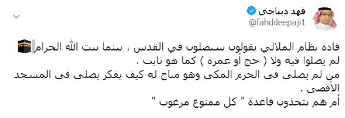 وكتب عبر تغريدة له على "تويتر" رصدها " المشهد العربي": "قادة نظام الملالي يقولون سيصلون في القدس ، بينما بيت الله الحرام الكعبة لم يصلوا فيه ولا ( حج أو عمرة ) كما هو ثابت" .