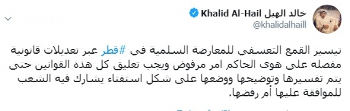 وكتب عبر تغريدة له على "تويتر" رصدها " المشهد العربي": "تيسير القمع التعسفي للمعارضة السلمية في قطر عبر تعديلات قانونية مفصلة على هوى الحاكم أمر مرفوض ويجب تعليق كل هذه القوانين حتى يتم تفسيرها وتوضيحها ووضعها على شكل استفتاء يشارك فيه الشعب للموافقة عليها أم رفضها".