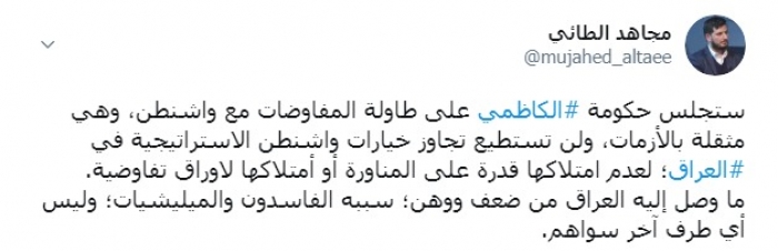 وكتب عبر تغريدة له على "تويتر" رصدها " المشهد العربي": "ستجلس حكومة الكاظمي على طاولة المفاوضات مع واشنطن، وهي مثقلة بالأزمات، ولن تستطيع تجاوز خيارات واشنطن الاستراتيجية في العراق؛ لعدم امتلاكها قدرة على المناورة أو امتلاكها لأوراق تفاوضية".