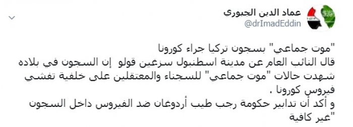 وكتب عبر تغريدة له على "تويتر" رصدها " المشهد العربي":""موت جماعي" بسجون تركيا جراء كورونا".