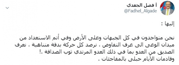 وكتب عبر تغريدة له على "تويتر" رصدها " المشهد العربي":"نحن متواجدون في كل الجبهات وعلى الأرض وفي أتم الاستعداد من ميدان الوغى إلى غرف التفاوض ، نرصد كل حركة بدقة متناهية ، نعرف الصديق من العدو بما في ذلك العدو المرتدي ثوب الصداقة".