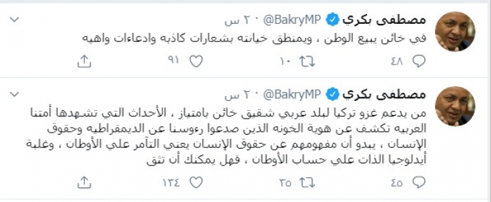 أكد البرلماني المصري مصطفى بكري، اليوم الخميس، أن من يدعم غزو تركيا لبلد عربي فهو خائن بامتياز.