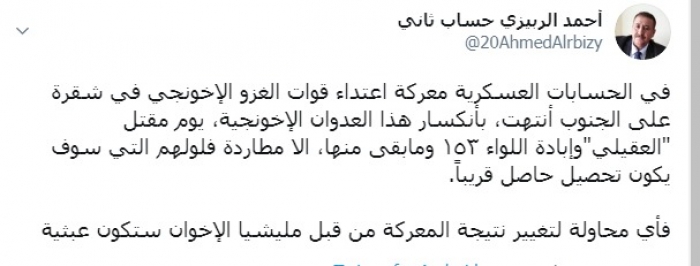 وكتب الربيزي عبر تغريدة له على "تويتر" رصدها " المشهد العربي": "في الحسابات العسكرية معركة اعتداء قوات الغزو الإخونجي في شقرة على الجنوب انتهت بانكسار هذا العدوان الإخونجي، يوم مقتل "العقيلي"وإبادة اللواء 153، وما بقى منها إلا مطاردة فلولهم التي سوف يكون تحصيل حاصل قريباً".