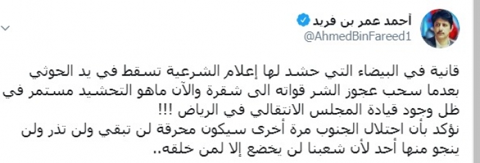 وكتب عبر تغريدة له على "تويتر" رصدها " المشهد العربي":"قانية في البيضاء التي حشد لها إعلام الشرعية تسقط في يد الحوثي بعدما سحب عجوز الشر قواته الى شقرة والآن هاهو التحشيد مستمر في ظل وجود قيادة المجلس الانتقالي في الرياض".