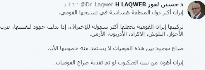 وكتب عبر تغريدة له على "تويتر" رصدها " المشهد العربي":"إيران أكثر دول المنطقة هشاشة في نسيجها القومي".