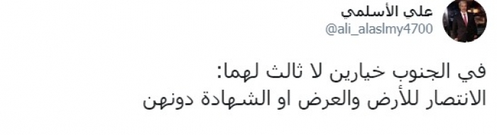 وكتب عبر تغريدة له على "تويتر" رصدها " المشهد العربي":"في الجنوب خيارين لا ثالث لهما: الانتصار للأرض والعرض أو الشهادة دونهم".