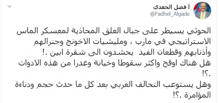 وكتب عبر تغريدة له على "تويتر" رصدها " المشهد العربي":"الحوثي يسيطر على جبال العلق المحاذية لمعسكر الماس الاستراتيجي في مأرب ، ومليشيات الإخونج وجنرالهم وأذنابهم وقطعان الفيد يحشدون إلى شقرة أبين ، هل هناك اوقح واكثر سقوطا وخيانة وغدرا من هذه الأدوات".