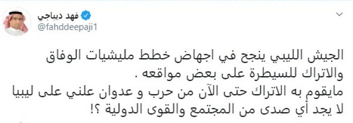 وكتب في تغريدة عبر "تويتر" رصدها "المشهد العربي": "الجيش الليبي ينجح في إجهاض خطط مليشيات الوفاق والأتراك للسيطرة على بعض مواقعه. ما يقوم به الأتراك حتى الآن من حرب وعدوان علني على ليبيا لا يجد أي صدى من المجتمع والقوى الدولية".