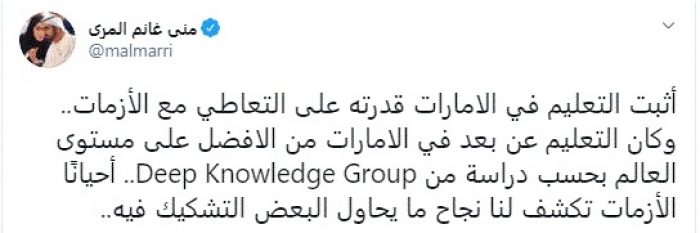 وكتبت في تغريدة عبر "تويتر" رصدها "المشهد العربي": "أثبت التعليم في الإمارات قدرته على التعاطي مع الأزمات.. وكان التعليم عن بعد في الامارات من الأفضل على مستوى العالم بحسب دراسة من Deep Knowledge Group.. أحيانًا الأزمات تكشف لنا نجاح ما يحاول البعض التشكيك فيه".