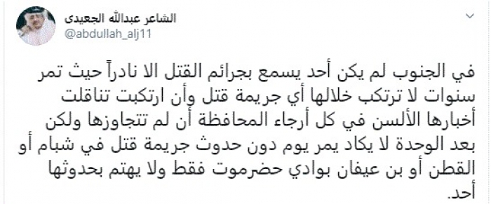 وقال في تغريدة عبر "تويتر" رصدها "المشهد العربي": "في الجنوب لم يكن أحد يسمع بجرائم القتل إلا نادراً حيث تمر سنوات لا ترتكب خلالها أي جريمة قتل وأن ارتكبت تناقلت أخبارها الألسن في كل أرجاء المحافظة أن لم تتجاوزها".
