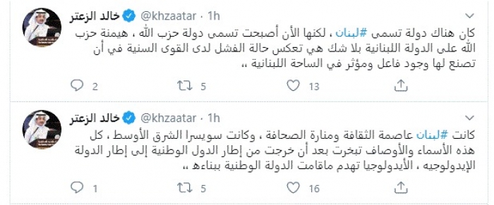 وكتب في تغريدات عبر "تويتر" رصدها "المشهد العربي": "كانت لبنان عاصمة الثقافة ومنارة الصحافة، وكانت سويسرا الشرق الأوسط ، كل هذه الأسماء والأوصاف تبخرت بعد أن خرجت من إطار الدول الوطنية إلى إطار الدولة الإيدولوجية، الأيدولوجيا تهدم ما قامت الدولة الوطنية ببناءه".