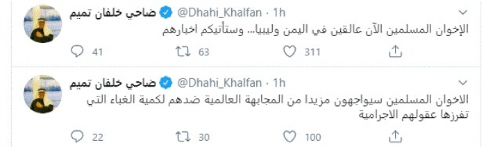 وأضاف في تغريدة أخرى: "الإخوان المسلمين الآن عالقين في اليمن وليبيا... وستأتيكم أخبارهم".