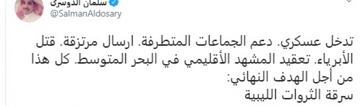 وقال في تغريدة عبر "تويتر" رصدها "المشهد العربي": "تدخل عسكري. دعم الجماعات المتطرفة. إرسال مرتزقة. قتل الأبرياء. تعقيد المشهد الأقليمي في البحر المتوسط. كل هذا من أجل الهدف النهائي: سرقة الثروات الليبية".