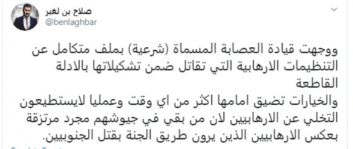 وكتب في تغريدة عبر "تويتر" رصدها "المشهد العربي": "ووجهت قيادة العصابة المسماة (شرعية) بملف متكامل عن التنظيمات الإرهابية التي تقاتل ضمن تشكيلاتها بالأدلة القاطعة".