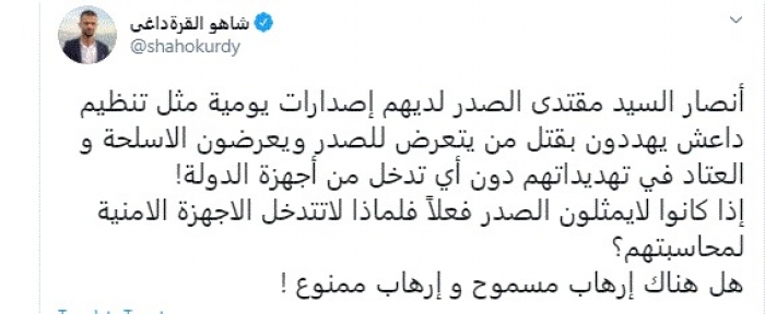 وقال في تغريدة عبر "تويتر" رصدها "المشهد العربي": "أنصار السيد مقتدى الصدر لديهم إصدارات يومية مثل تنظيم داعش يهددون بقتل من يتعرض للصدر ويعرضون الأسلحة والعتاد في تهديداتهم دون أي تدخل من أجهزة الدولة".