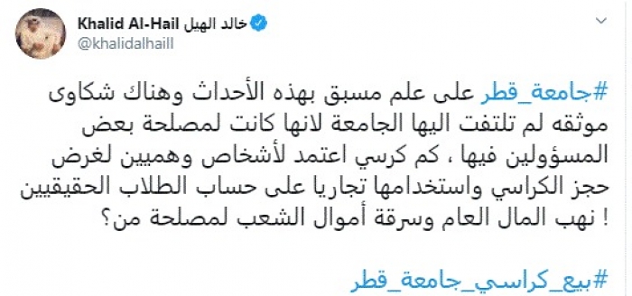 وجه المعارض القطري البارز خالد الهيل، اليوم، انتقادًا لاذعًا للنظام القطري جراء الفساد داخل جامعة قطر.