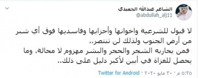وكتب "الجعيدي" في تغريدة عبر حسابه بتويتر، رصدها "المشهد العربي": "لا قبول للشرعية وإخوانها وأحزابها وفاسديها فوق أي شبر من أرض الجنوب ولذلك لن تنتصر".