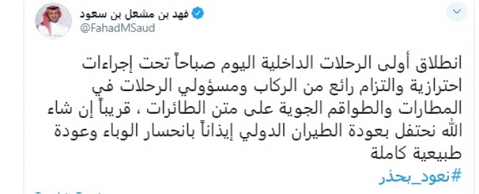 وقال في تغريدة عبر "تويتر" رصدها "المشهد العربي": "انطلاق أولى الرحلات الداخلية اليوم صباحاً تحت إجراءات احترازية والتزام رائع من الركاب ومسؤولي الرحلات في المطارات والطواقم الجوية على متن الطائرات، قريباً إن شاء الله نحتفل بعودة الطيران الدولي إيذاناً بانحسار الوباء وعودة طبيعية كاملة".