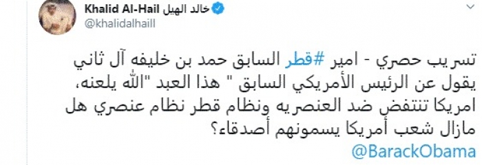نشر المعارض القطري البارز خالد الهيل، اليوم، تسريب لأمير قطر السابق حمد بن خليفة آل ثاني يصف فيه الرئيس الأمريكي السابق باراك أوباما بالعبد.
