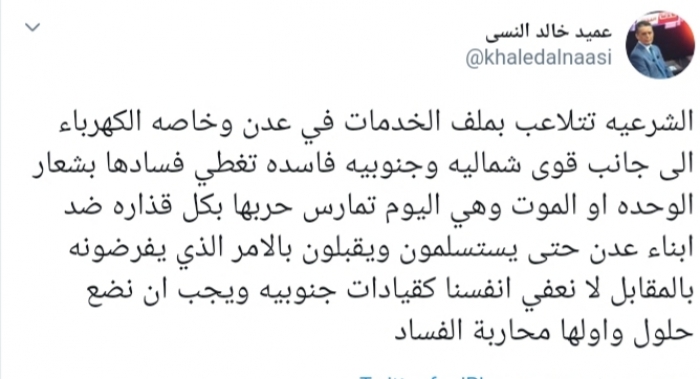 أكد الكاتب والمحلل العسكري خالد النسي، اليوم الأحد، أن الشرعية تتلاعب بملف الخدمات في العاصمة عدن وخاصة الكهرباء، مطالبا القيادات الجنوبية بالبدء في محاربة الفساد.